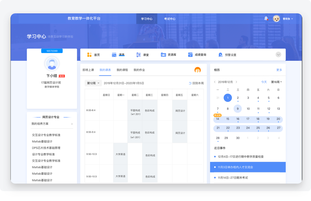 学生可以在平台(移动端、PC端)上浏览本专业人才培养方案、课程标准、授课计划课表、教学进程表、校历等教学文件在內的专业课程信息